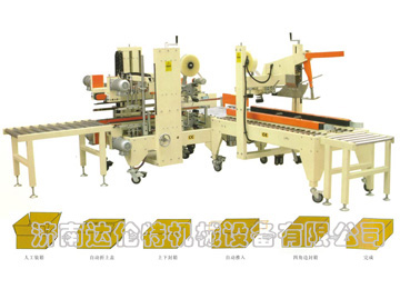 ★工藝流程:紙箱經(jīng)前段折蓋封箱機(jī)封箱→90度轉(zhuǎn)角機(jī)→推入角邊封箱機(jī)完成上下四角邊封箱→“工”字型封箱;也可與自動(dòng)化包裝流水線(xiàn)配套使用。